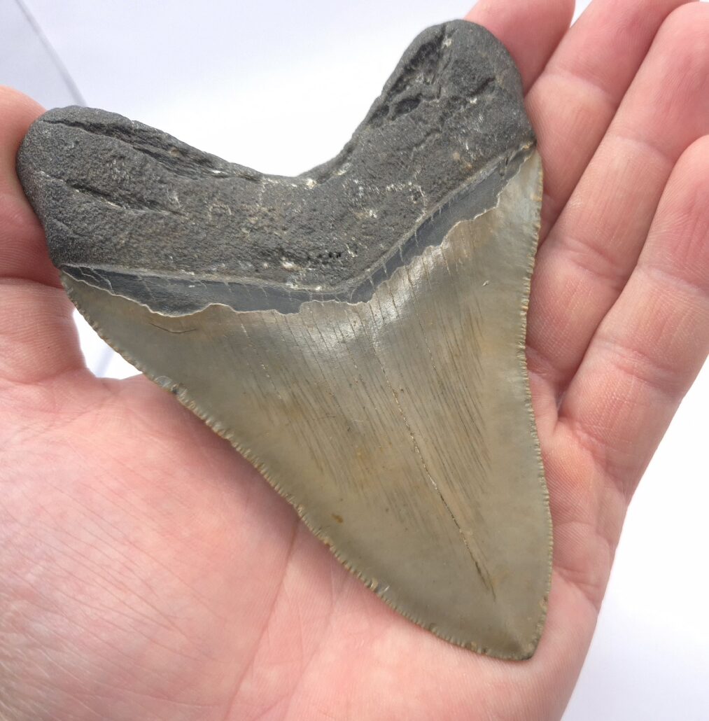 Er hat eine schöne schwarze Bourlette (Zahnschmelz), die Wurzel ist gut erhalten und er ist sehr gut gezackt an der Schneide.