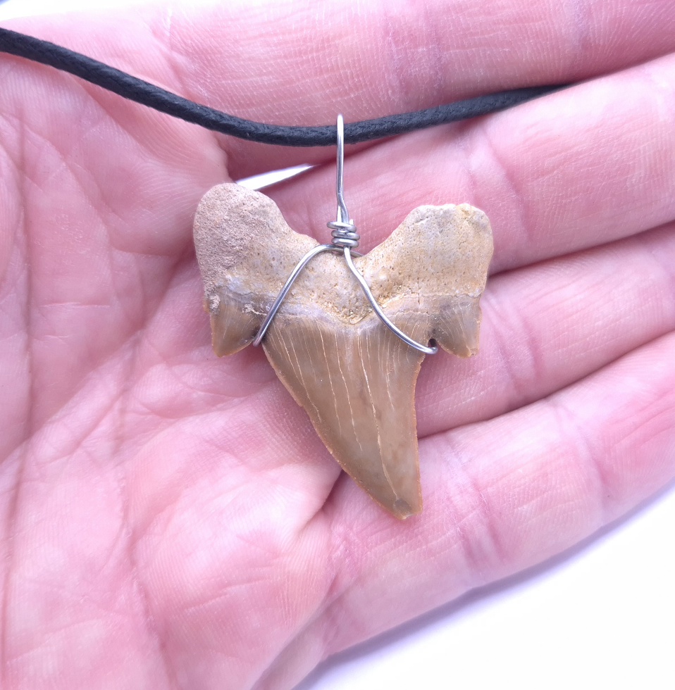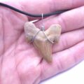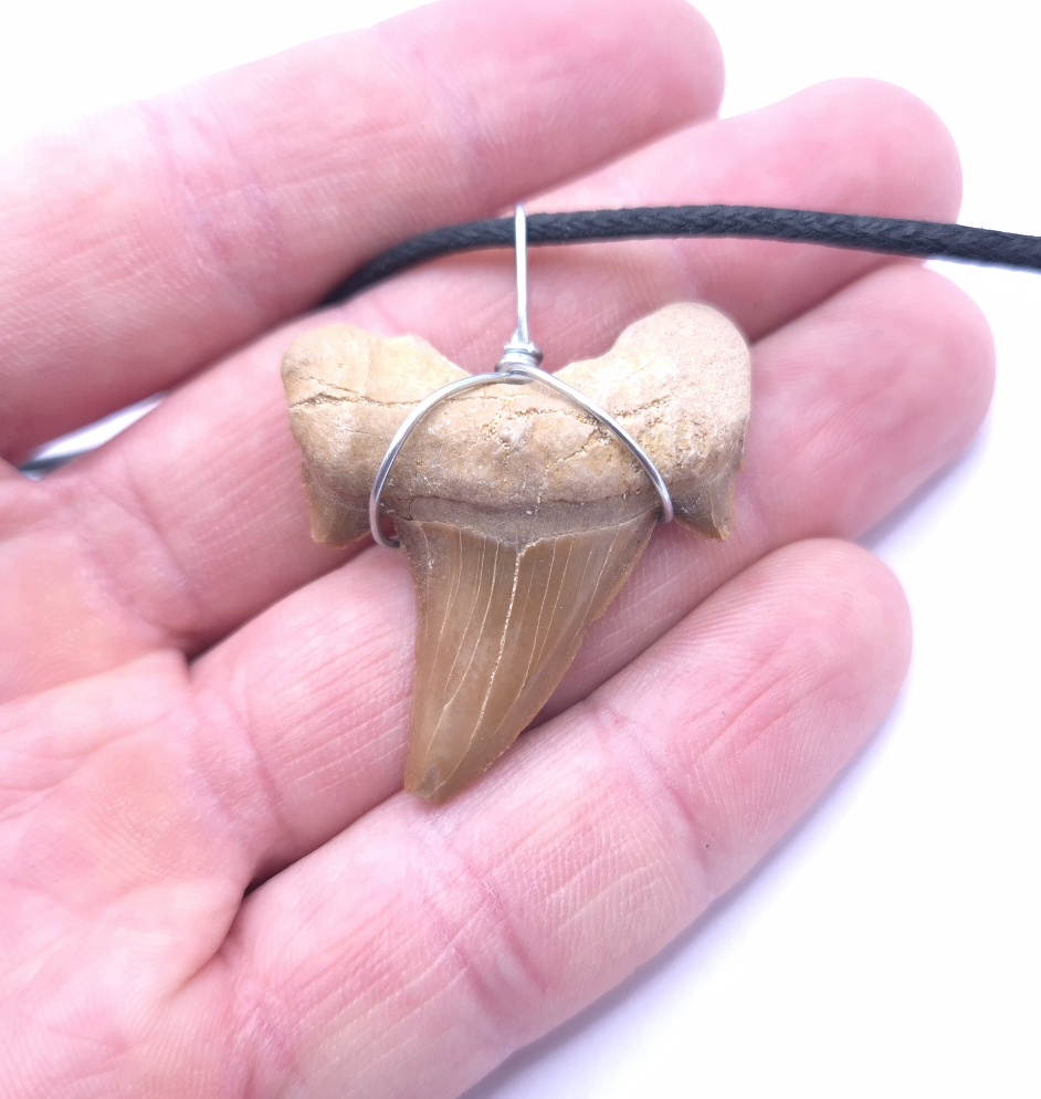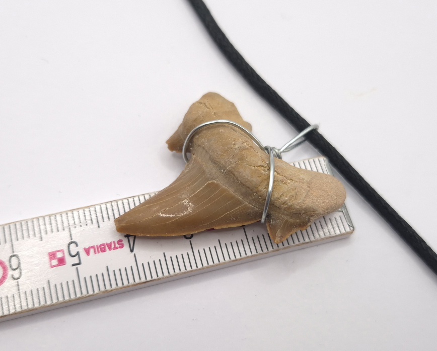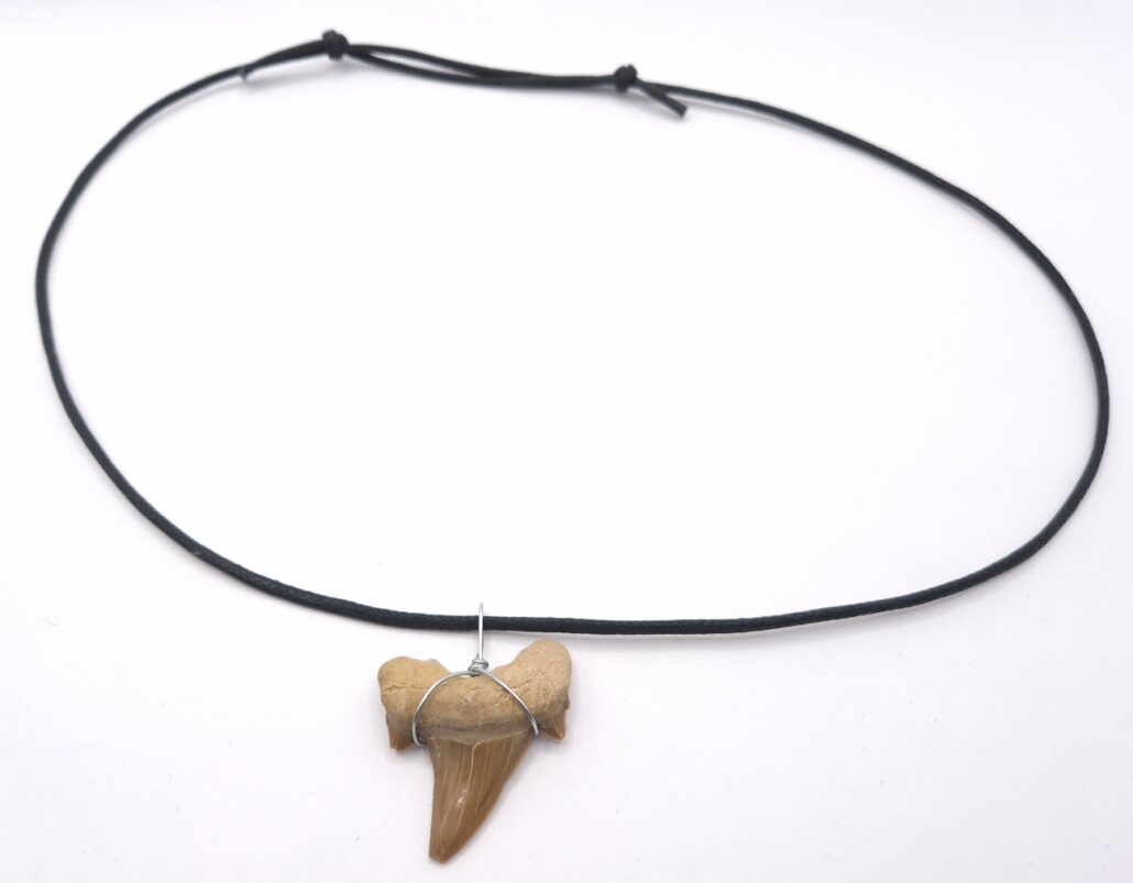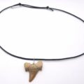Schöne Halskette mit einem versteinerten Haizahn (Otodus obliquus) aus Marokko. Der Zahn ist mehrere Millionen Jahre alt.