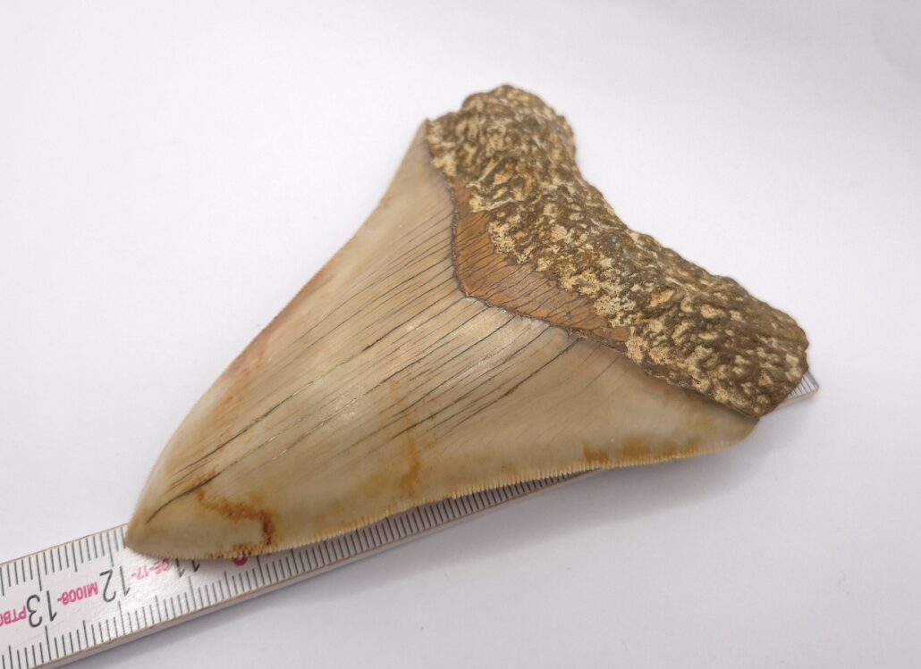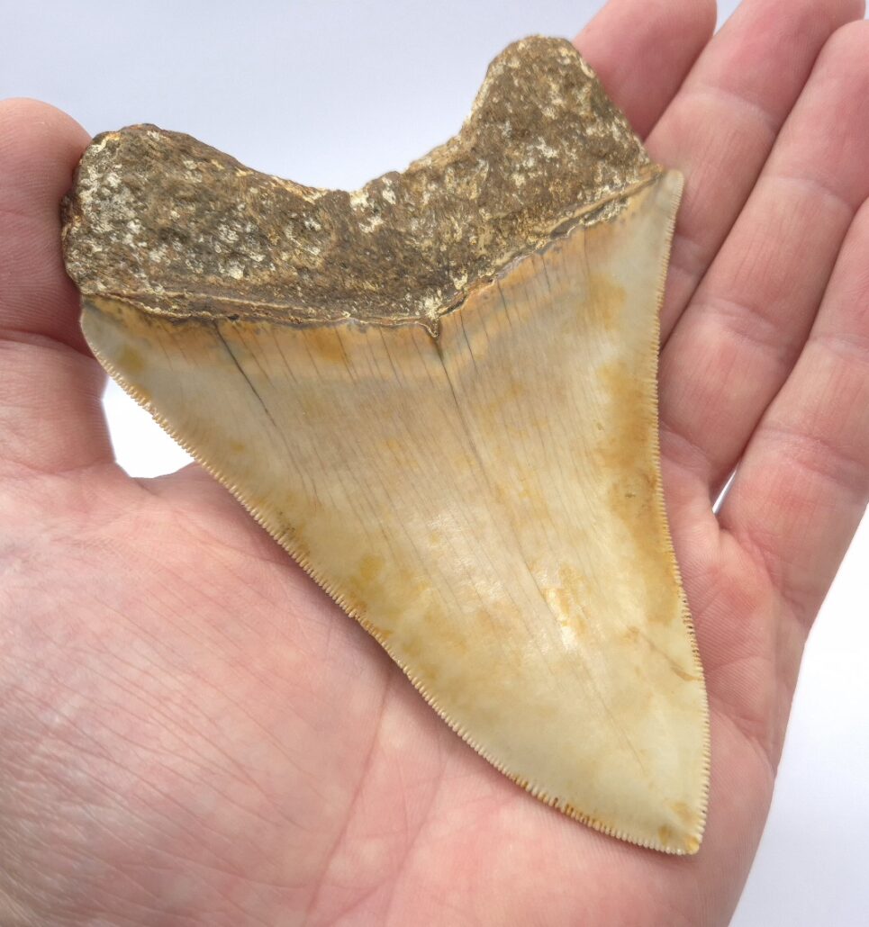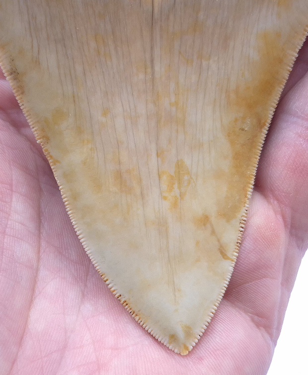 Weiß/beige Megalodon Haizahn. Perfekt gezackt !