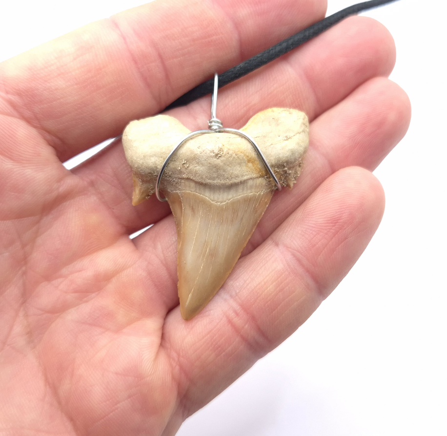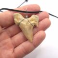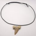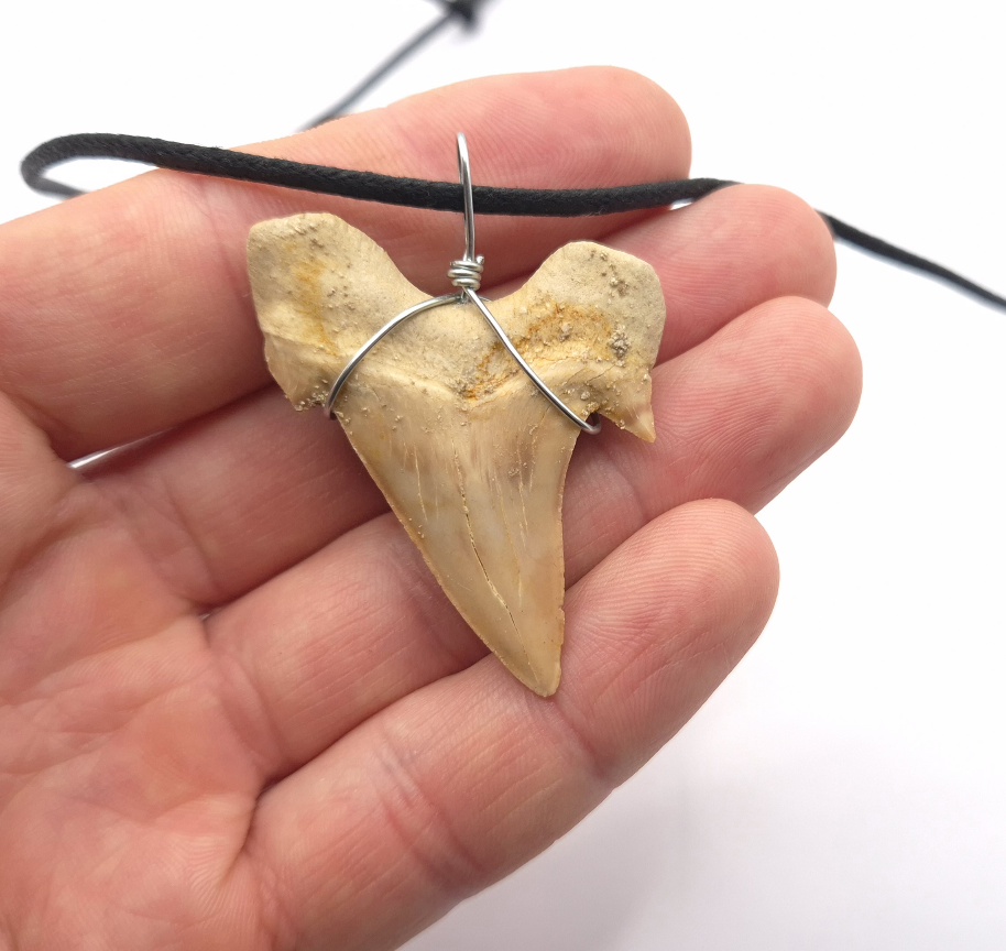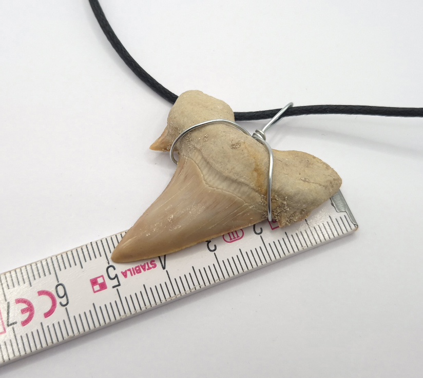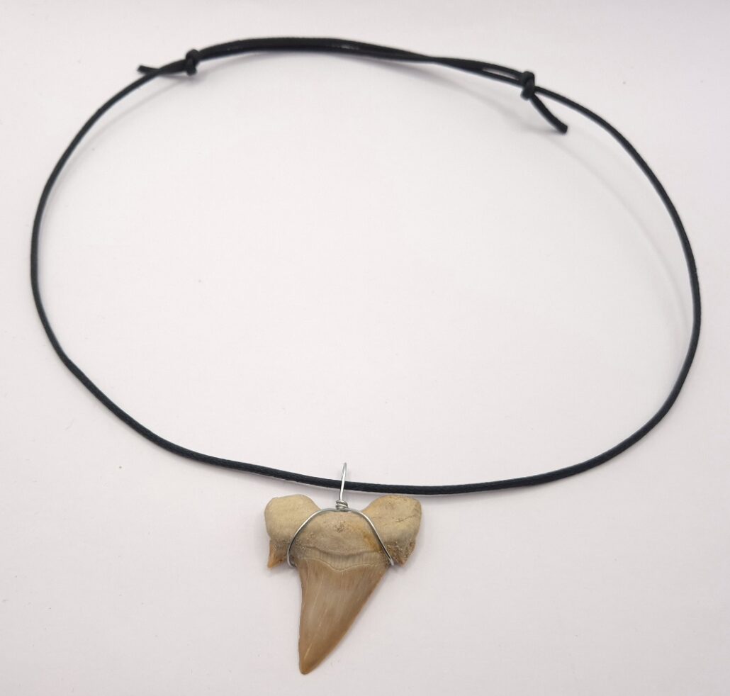 Schöne Halskette mit einem versteinerten Haizahn (Otodus obliquus) aus Marokko. Der Zahn ist mehrere Millionen Jahre alt.