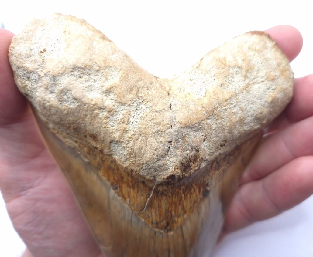 Der Zahn hat auf der Vorderseite der Wurzel einen kleinen Riss. Dieser wurde mit Sediment geschlossen.