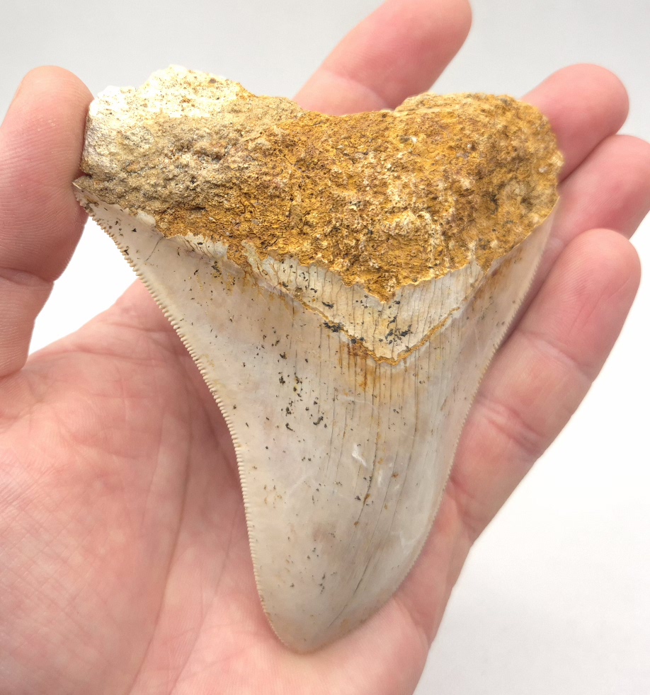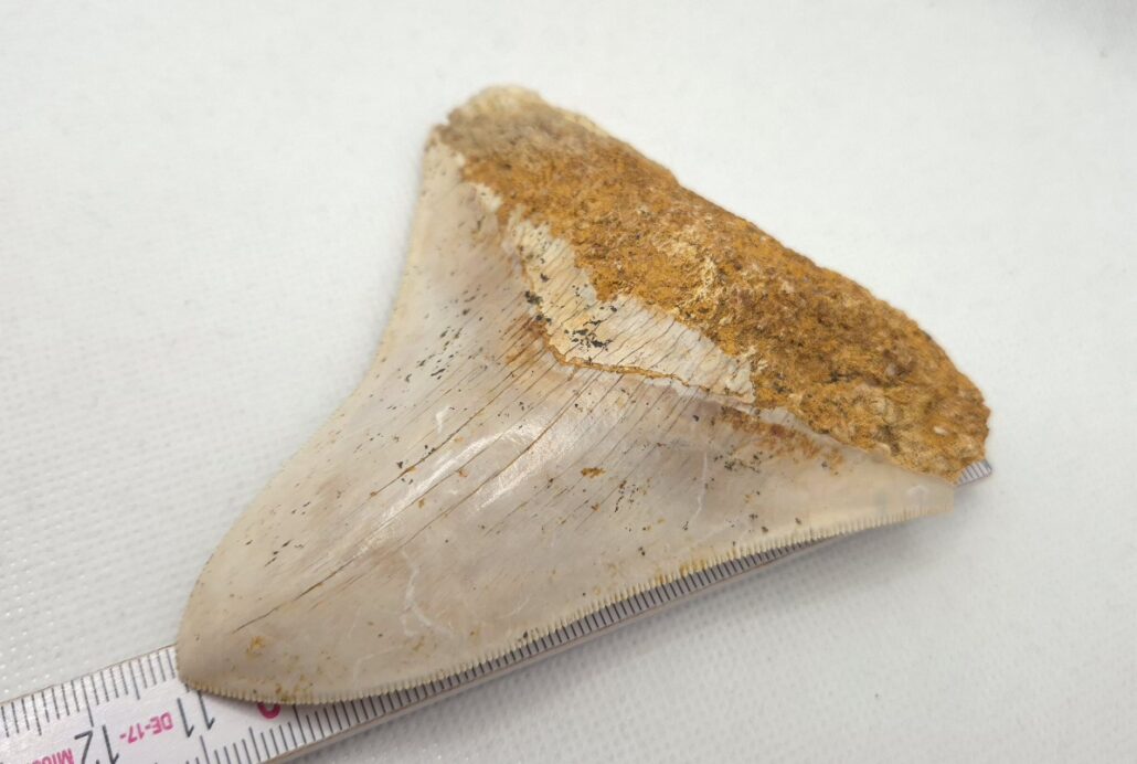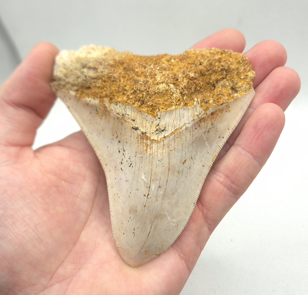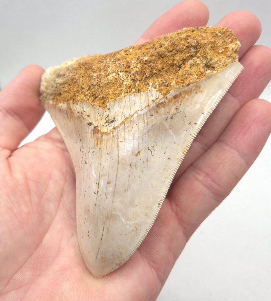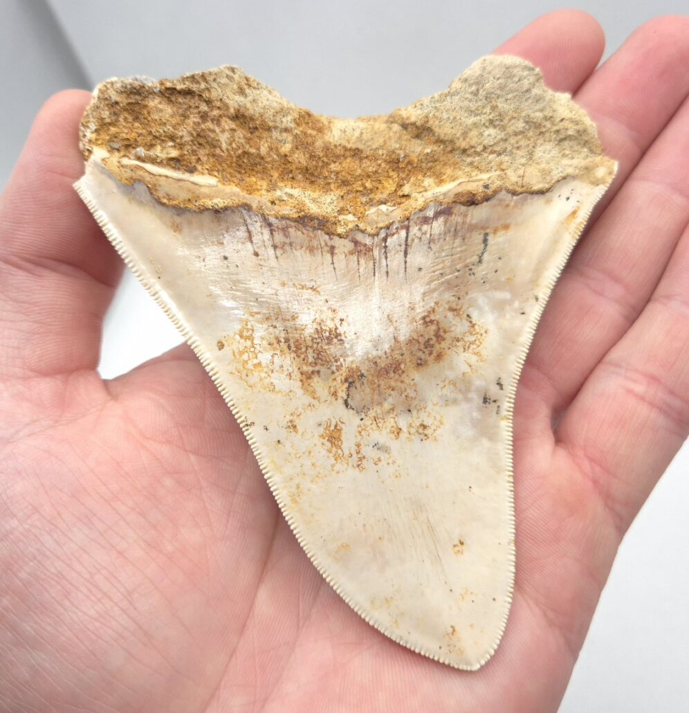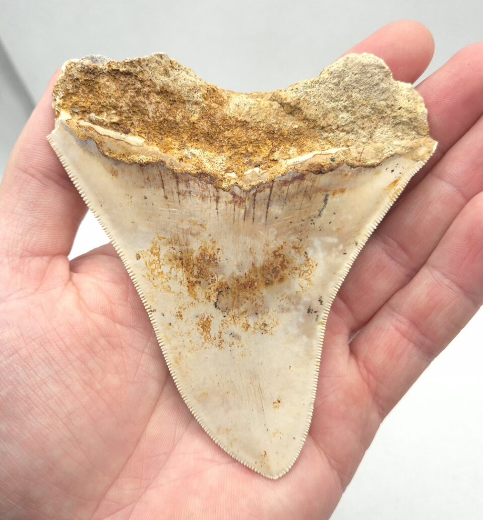 Weiß/beige Megalodon Haizahn. Perfekt gezackt !